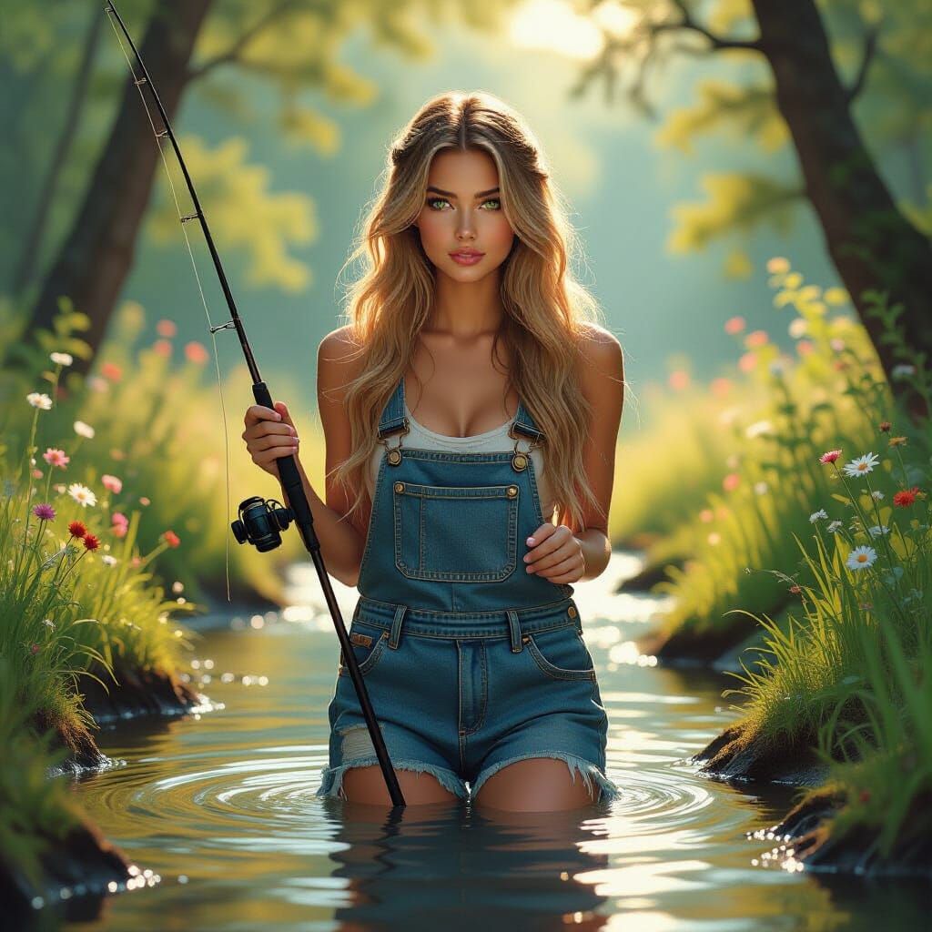 A striking picture of a girl with golden hair and green eyes in a creek. The digital painting, reminiscent of Art Nouveau, captures the surrounding forest and wildflowers with warm and vibrant colors.