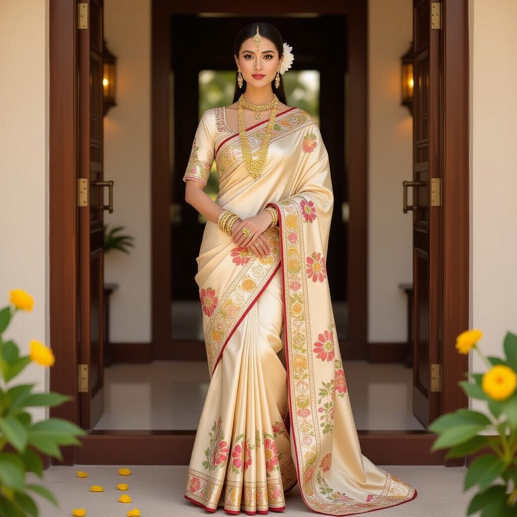 This image shows an elegant Chinese woman in traditional clothing. She is wearing a cream-colored sari with pink and gold floral patterns and is adorned with gold jewelry in an art nouveau style.