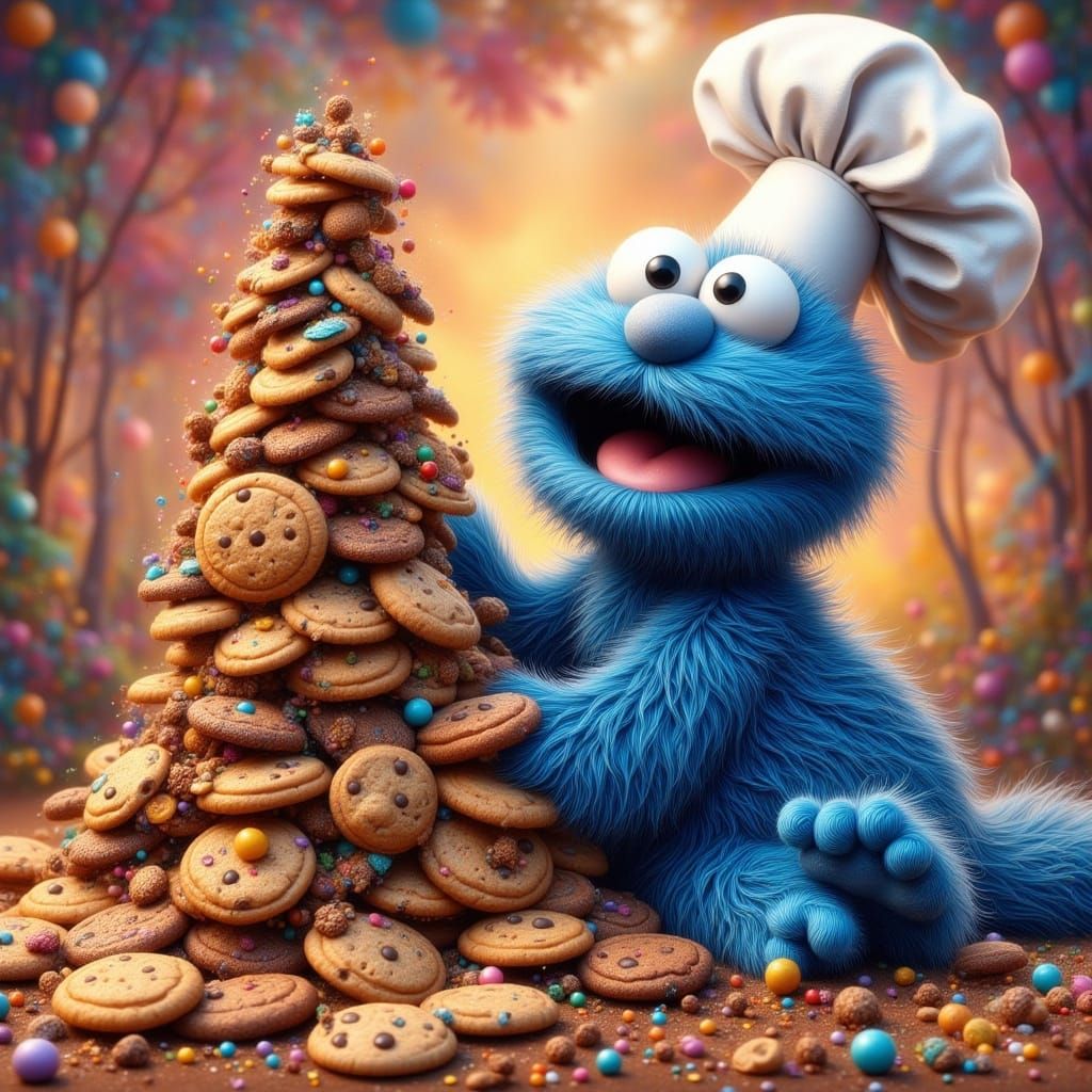 This image shows the Cookie Monster from Sesame Street gleefully eating a mountain of cookies. He is wearing a chef's hat against a rainbow background, rendered as digital art with intricate details and shining colors.