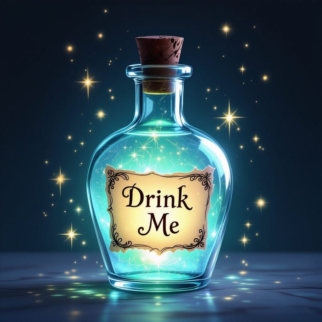 This image shows a vintage glass potion bottle with a soft, phosphorescent glow and magic sparkles. The label reads "Drink Me" in elegant script, rendered in a hyperrealistic style with luminous details.