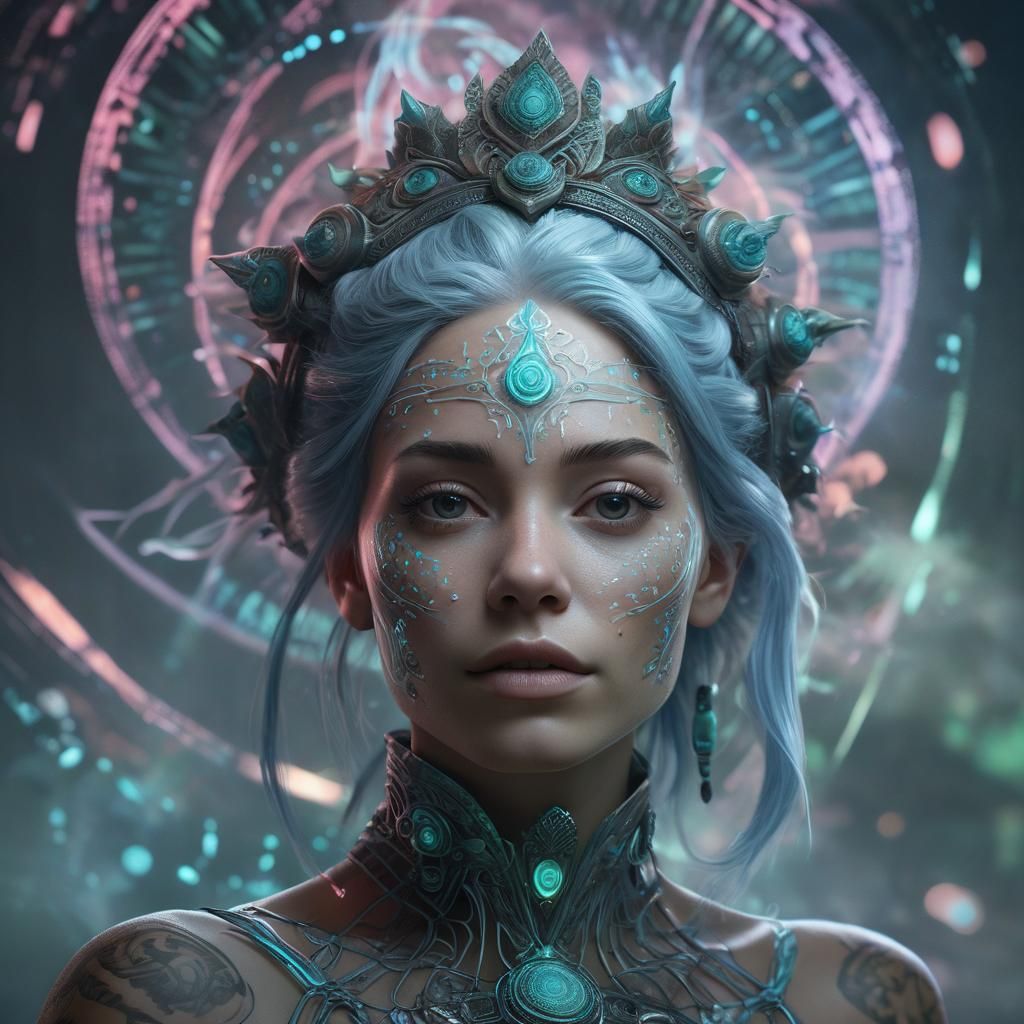 A vivid portrait of a woman with glowing headdress and blue hair, illuminated by a lantern. The digital art features volumetric lighting in pink, blue, and green, with swirling wisps creating a hyper-realistic, cartoon-stylized effect.