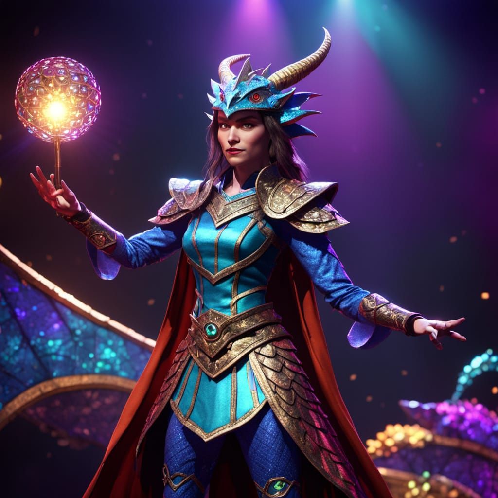 This image shows a female dragonborn heroine performing magic on a brightly lit stage. She wears a glittering costume with shimmering scales, illuminated by vivid, colorful lights. The scene has a 3D animated, Pixar-style aesthetic.