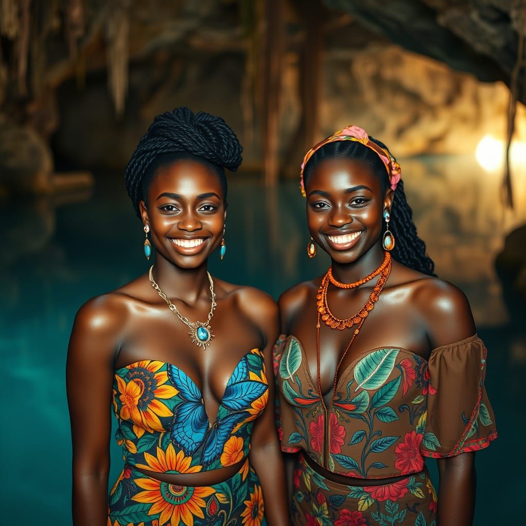 This image shows two smiling Black women in colorful streetwear, posing before a Mexican cenote. The image is a digital artwork with hyperrealistic detail and a cinematic atmosphere.