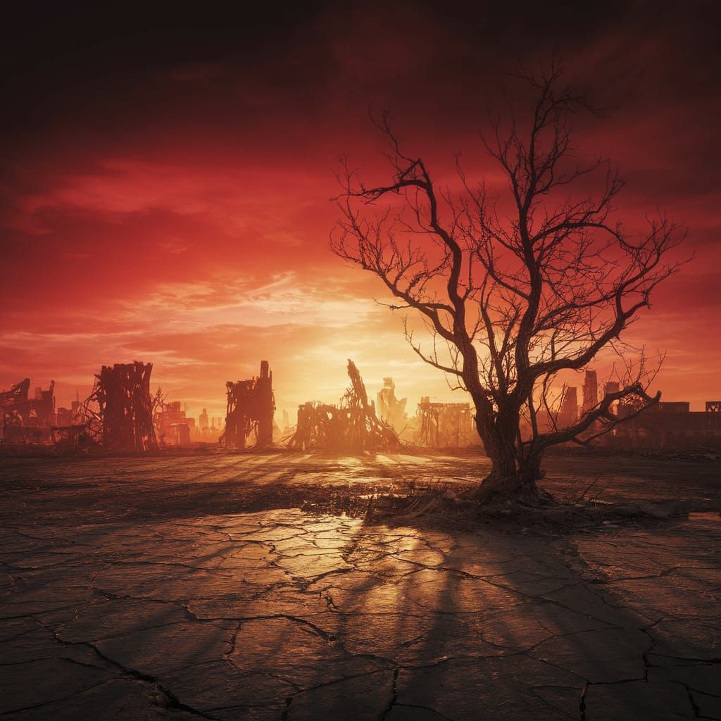 This image shows a haunting, post-apocalyptic wasteland scene with a lone tree standing in the foreground, set against a blood-red sky with remnants of a city in the distance, bathed in warm, golden hues.