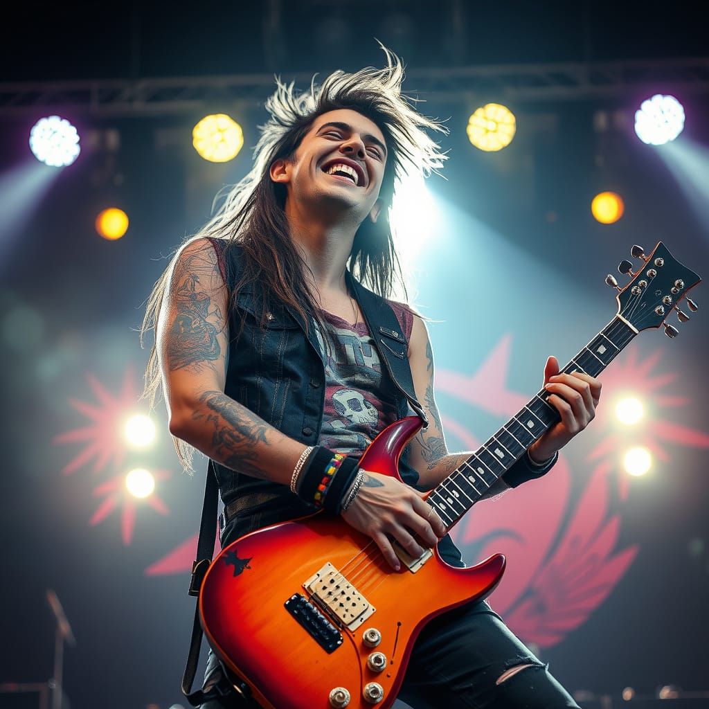 A confident rockstar with visible tattoos and smudged eyeliner poses with a guitar, illuminated by blazing stage lights in a grungy concert setting. Features dynamic textures.
