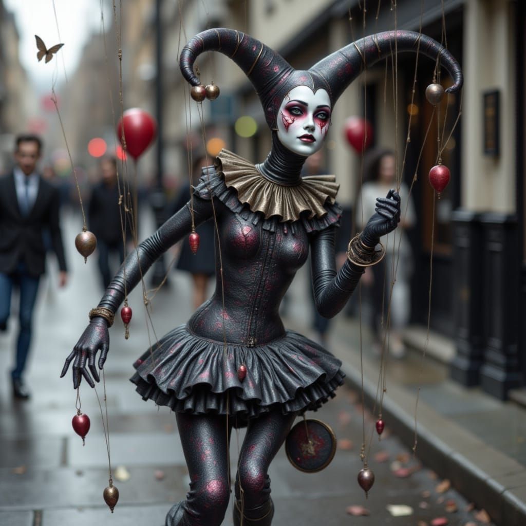 This image shows a graceful black and white jester ballerina puppet with strings controlling her hands. She stands on a London sidewalk, a single red tear hinting at her story of heartbreak.