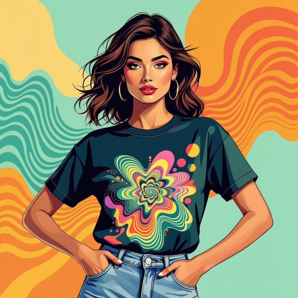 This image shows a model in a vintage 80s t-shirt featuring abstract vector fractal patterns with 3D shading. The pose and design evoke a futuristic, high-fashion airbrush aesthetic.