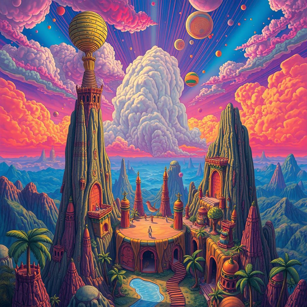 This image is a vibrant, surreal representation of Uluṟu, blending elements of melting objects, impossible architecture, and psychedelic linework to create a dreamlike atmosphere.