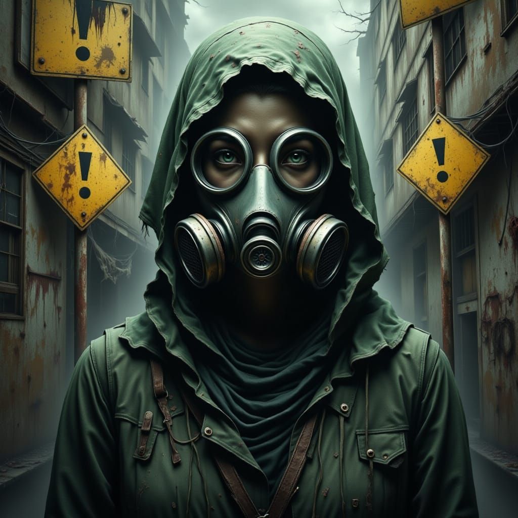 This image shows a woman wearing a tattered gas mask amidst toxic smoke, rotting flesh, and hazard signs. The artwork is rendered in a dark fantasy style with a muted, apocalyptic color palette.