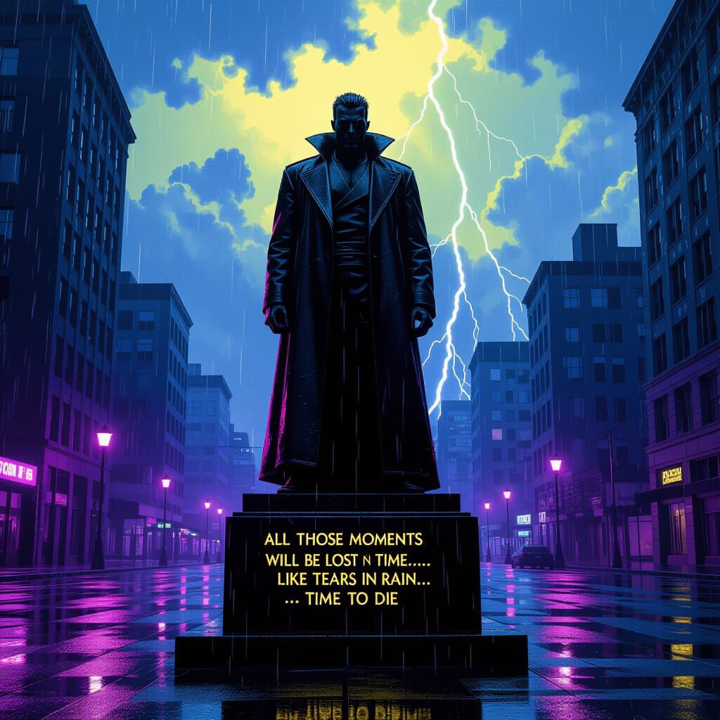 This image depicts a lone statue of Roy Batty from Blade Runner in a rain-soaked urban square. Vivid purple and yellow lights create a dramatic, atmospheric cyberpunk scene with intense rain and lightning.