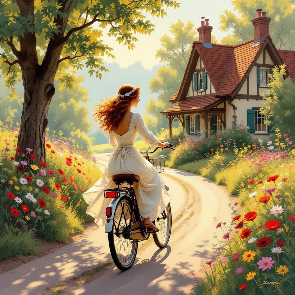 A stylized halftone print of a young woman with flowing red hair, wearing a billowing white dress, gracefully riding a vintage bicycle down a sun-dappled lane. The path, bordered by wildflowers in a riot of colors, winds towards a charming cottage nestled in the trees. The halftone pattern, rendered in sepia tones, evokes a sense of timeless beauty and romantic nostalgia, reminiscent of classic storybook illustrations. Photographic halftone effect with bold contrasting colors and vintage printed