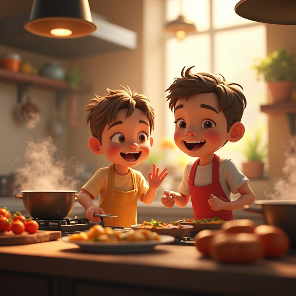 This image shows a lively kitchen scene with happy children cooking together, surrounded by oversized pots, steam, and vibrant ingredients, created in a realistic 3D digital art style reminiscent of Pixar and Disney
