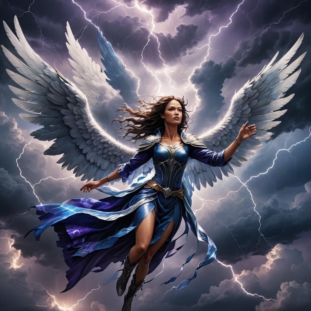 Anjo da Tempestade: Uma mulher com asas poderosas e elétricas, brilhando com tons de azul e branco. Ela está voando em meio a uma tempestade...