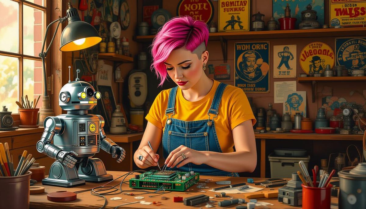 A vibrant image of BB8 observing a woman repairing a vintage robot toy in her workshop. The scene is reminiscent of impressionist paintings with bold brushstrokes and rich, clashing colors.
