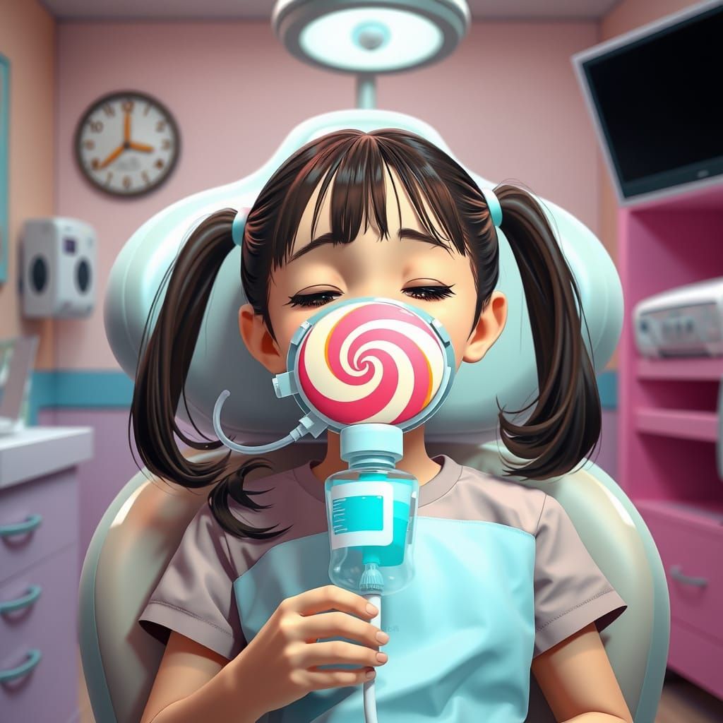 This image shows a hyper-realistic anime scene in a candy-colored dental room. A girl with pigtails peacefully inhales through a lollipop-shaped anesthesia mask, rendered with meticulous detail in a digital art style.