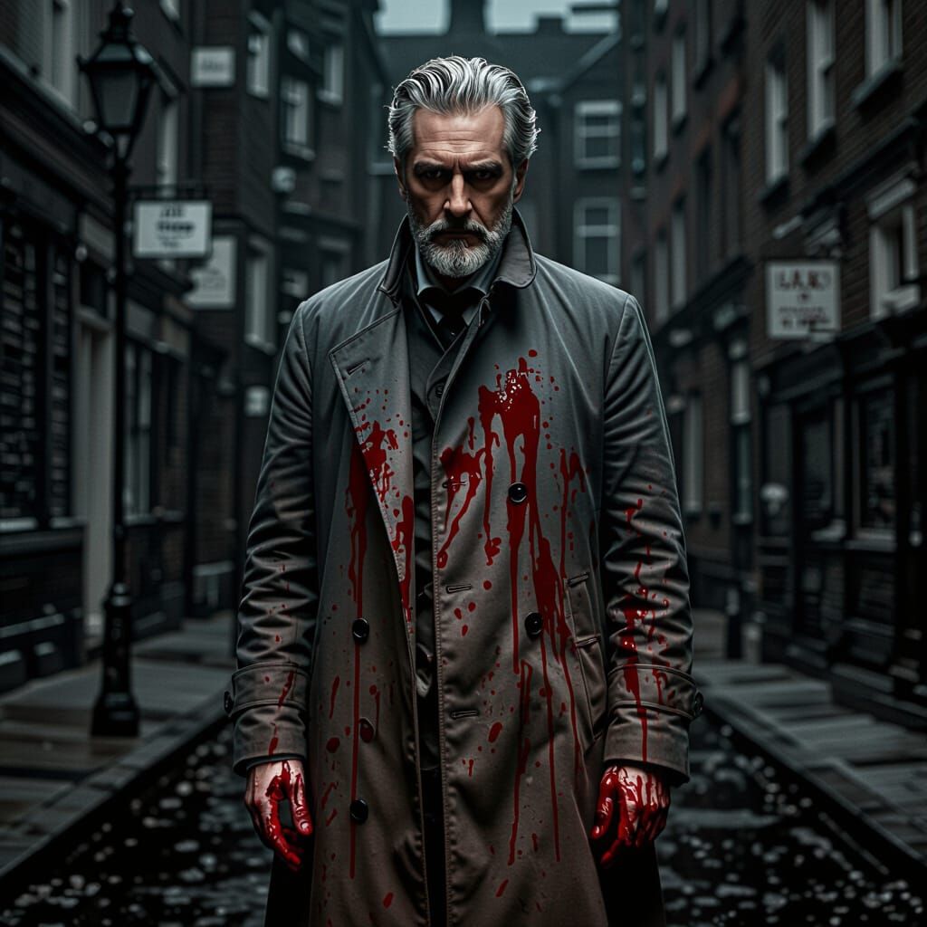This image shows a Victorian man with grey hair and bloody hands on a foggy street. The black and white image evokes a film noir horror aesthetic.