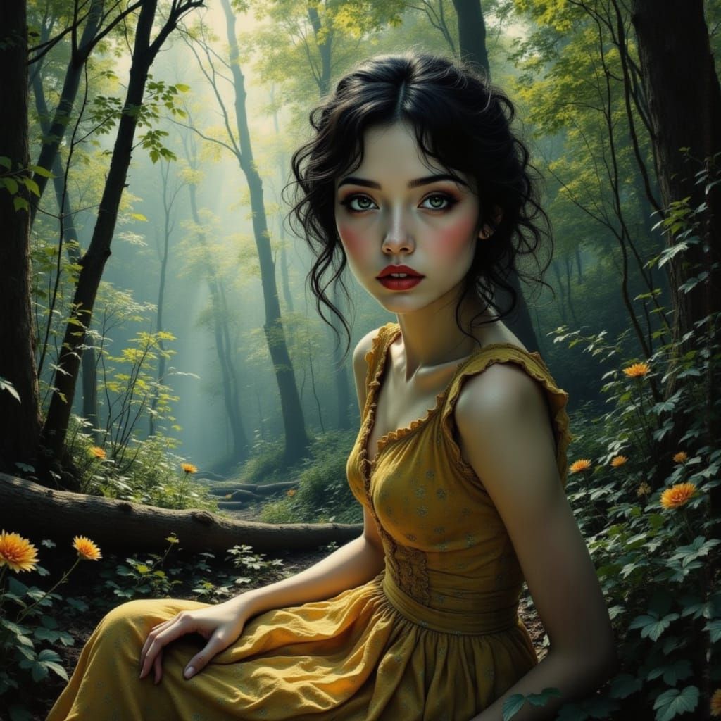 A surreal portrait of a pale woman in a forest. This striking image in encrustique style evokes a fairytale atmosphere.