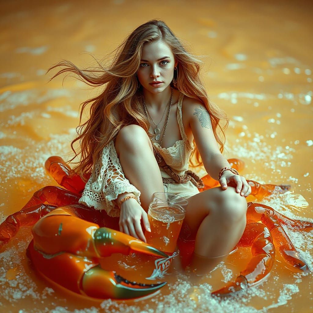 This image depicts a youthful woman with golden hair, dressed in bohemian attire, resting on a giant gummy crab. The scene is set in a surreal soda sea with warm, vibrant colors and soft lighting.