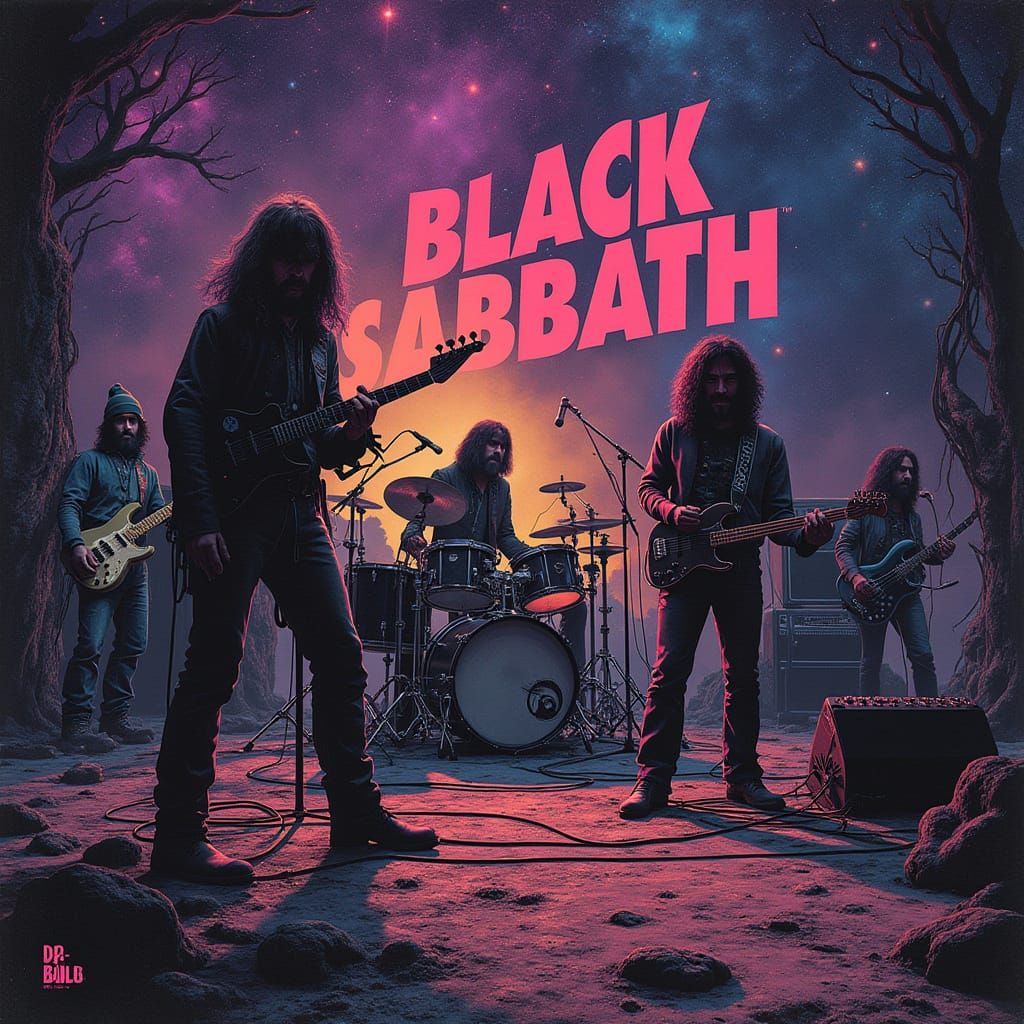 A vivid image of a psychedelic concert featuring a rock band in 1970s attire, set against a cosmic backdrop. The scene is reminiscent of a vintage LP cover with bold, swirling patterns.