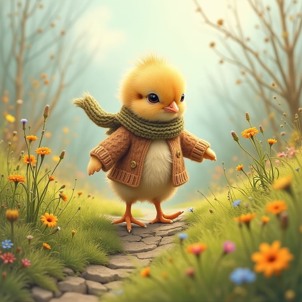 This image shows a small chick wearing a sweater and scarf walking up a grassy hill. The scene is filled with wildflowers and rendered with whimsical details reminiscent of classic fairy tale illustrations.