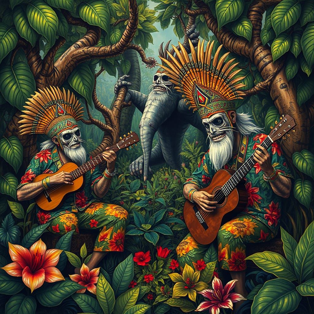 This surreal image depicts musicians playing psychedelic instruments in a lush, Polynesian environment, surrounded by fantastical creatures and intricate patterns, evoking a dreamlike atmosphere reminiscent of Android Jones and Robert Venosa's works.
