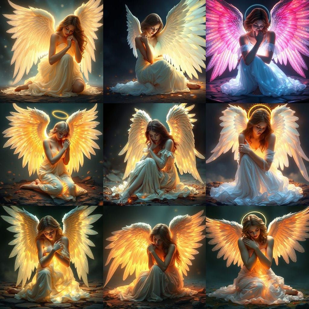 A digital painting of a luminous angel sitting on the ground. Her wings, made of light, gently cover her, highlighting her sad face. The image features vibrant colors and a captivating composition in a figurative art style.