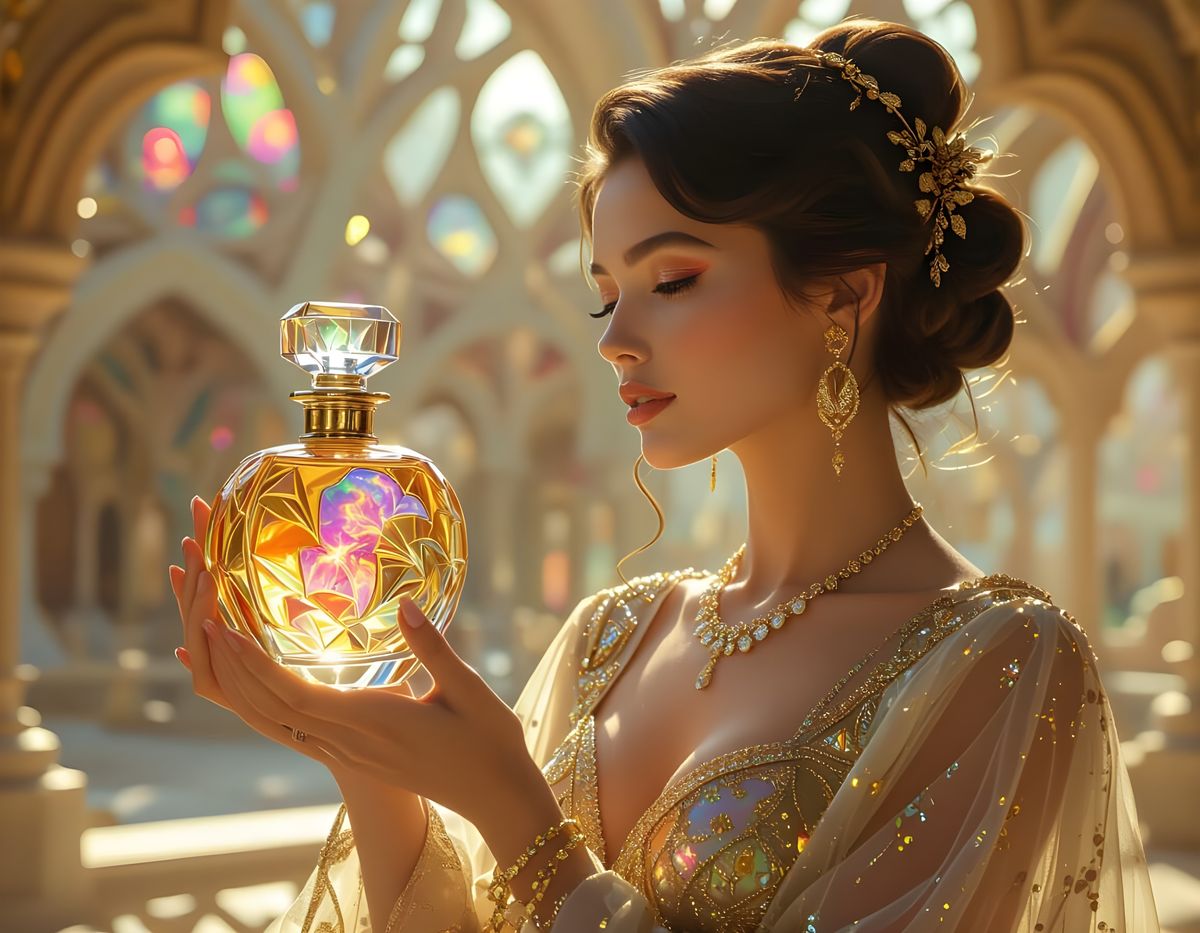 A striking picture of a golden woman holding a perfume bottle. The glass perfume bottle is shaped like a provocative woman and filled with a complex sculpture, rendered with vivid colors and dynamic lighting.