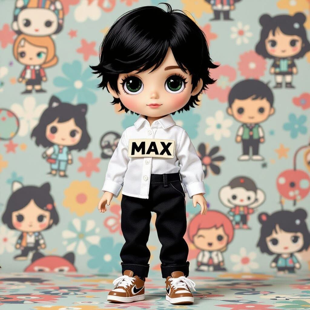 This image shows a stylized digital illustration of a black-haired boy doll wearing a white shirt, black pants and brown sneakers with a name tag. The image is in a vibrant pop art manga style.