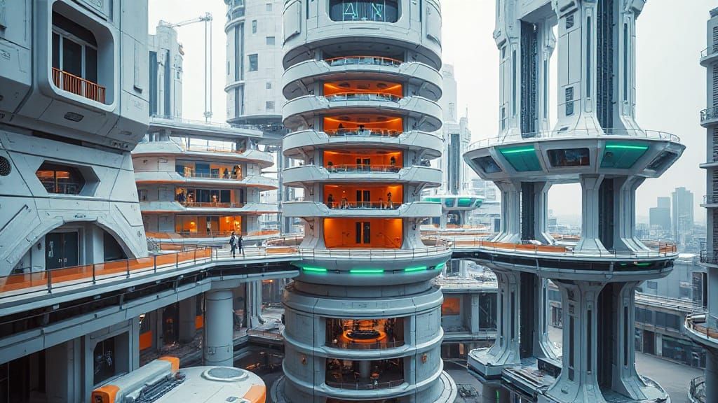 aerial panoramic photo of a huge futuristic city with multi levels and walkways and alcoves and cyber mechanisms and segmented towers with horizontal oblong but asymmetrically shaped levels. white orange teal lime green. neon and plastic. atmospheric and epic and misty and highly photorealistic. insanely ...