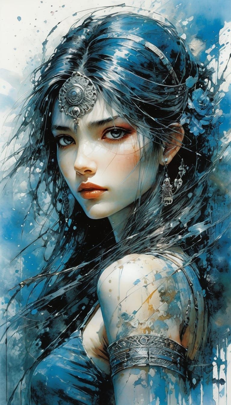 This image shows an abstract portrait of a woman. The artwork features complementary colors and fine details, with an aesthetic inspired by comic art and illustration.