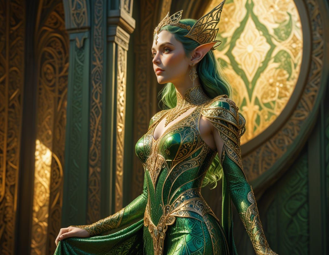 A full shot of a standing elven princess with pointed ears, wearing a green metallic gown. The image features an Art Deco aesthetic with luxurious textures in vivid colors.