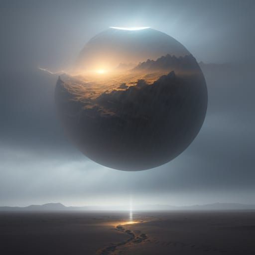 This atmospheric digital painting depicts a glowing orb floating through windswept dunes during a rainstorm, featuring moody blues and soft whites.