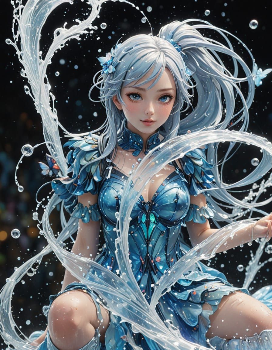 This image shows a butterfly meticulously crafted from water spray, featuring luminous, translucent wings with delicate patterns. Shimmering droplets cascade in iridescent light, presented as a vibrant oil painting.