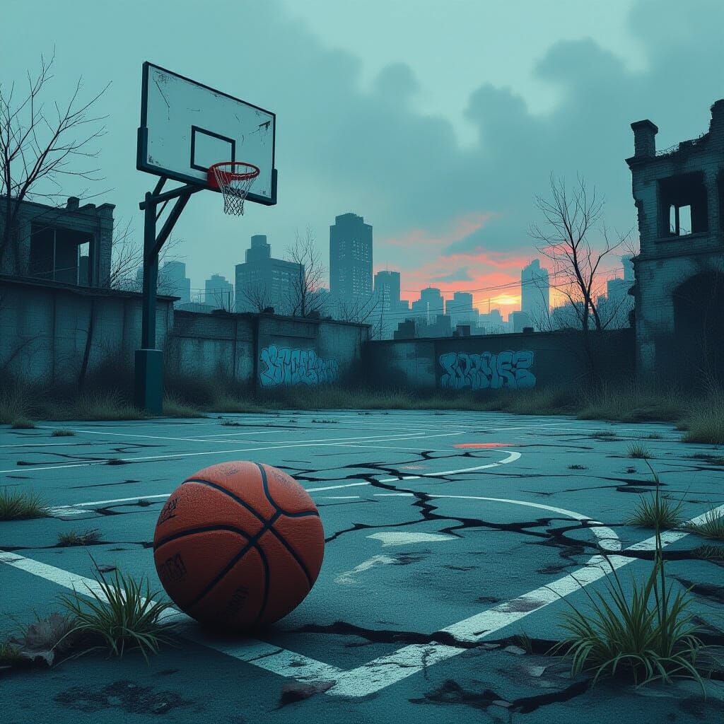 This image shows a weathered basketball resting on a dilapidated court overtaken by nature. The scene evokes a post-apocalyptic world with muted tones and eerie lighting in a dystopian style.