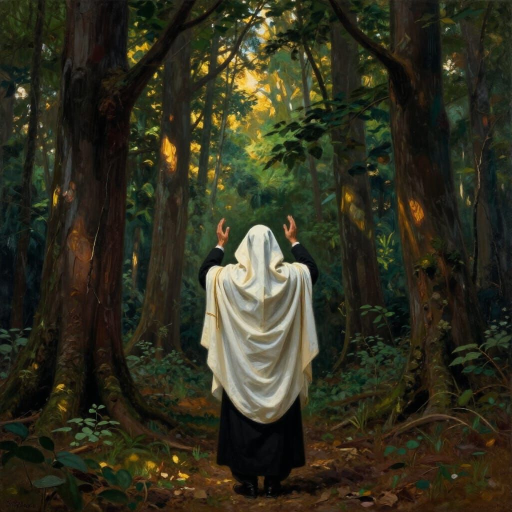 This image shows a man in prayer, hands raised to the sky in a dense forest. Rendered in a dramatic, painterly style with golden light filtering through trees, evoking a sense of spiritual communion.