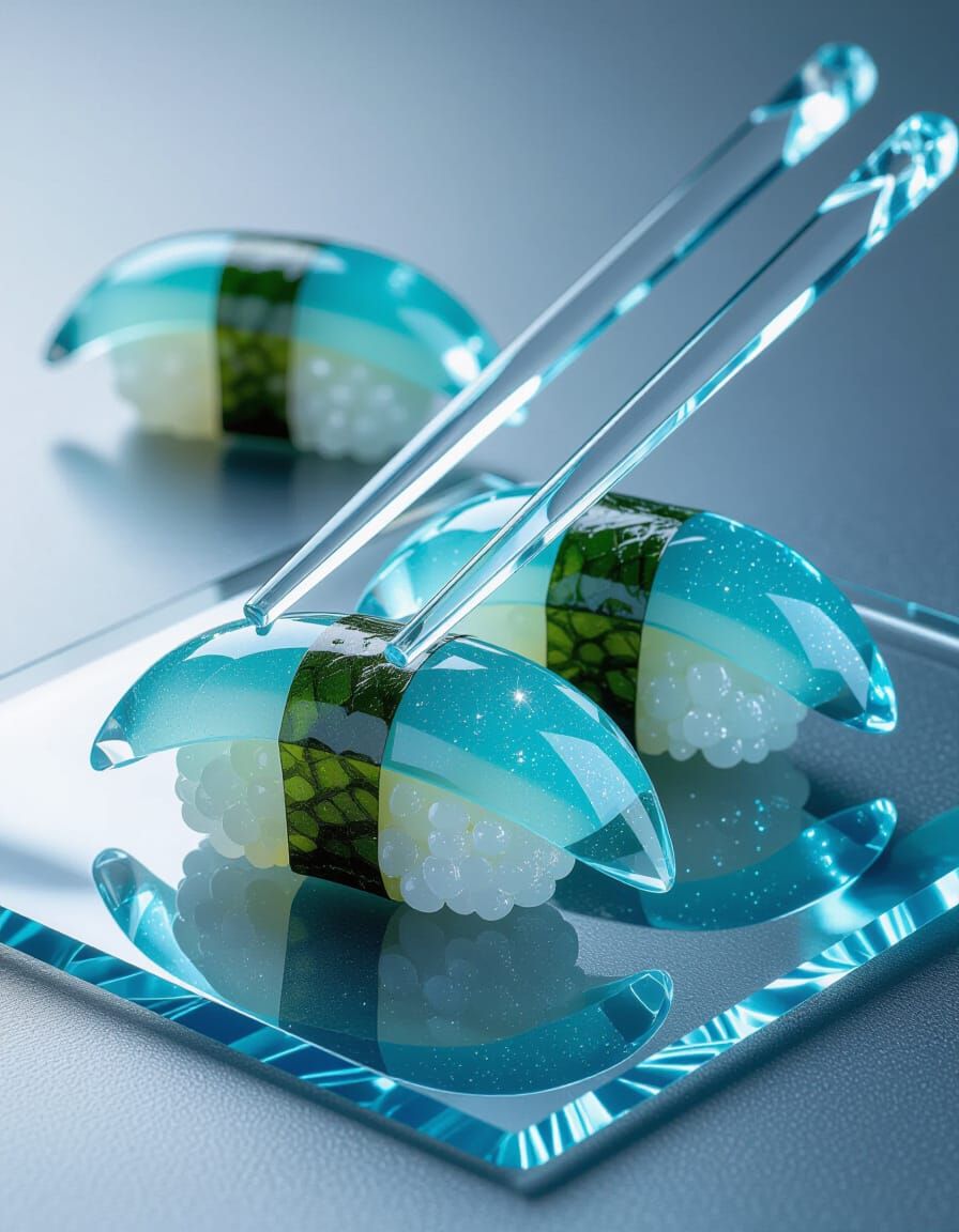 A striking picture of aquamarine nigiri sushi and chopsticks. The objects are made of translucent crystal glass with a delicate, sparkling appearance, in a Chihuly-inspired glasswork style.