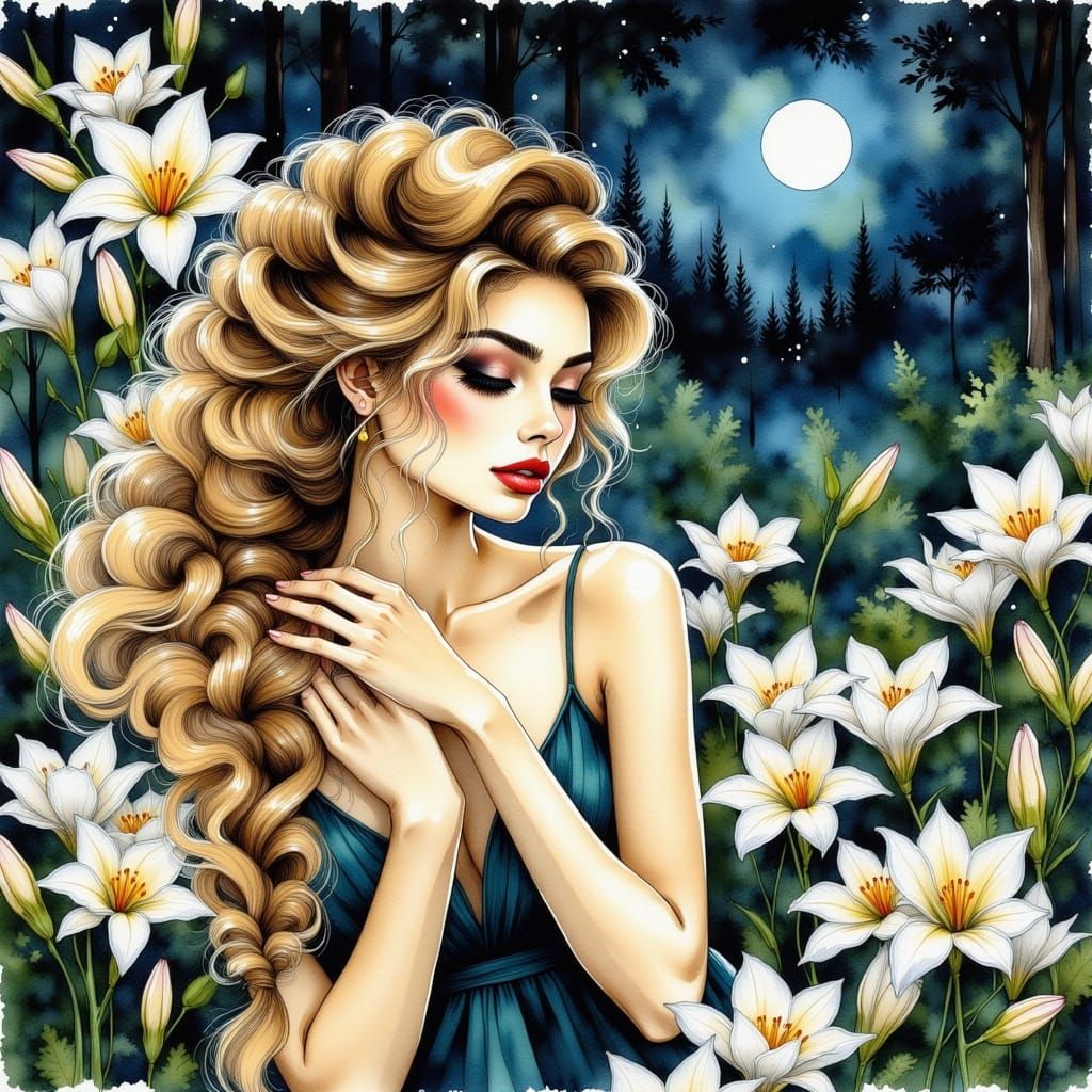 This image shows a feminine silhouette with flowing arabesque hair, holding a garland of white lilies. Rendered in sepia ink with gouache highlights, it evokes mystery and elegance in a luminous watercolor style.