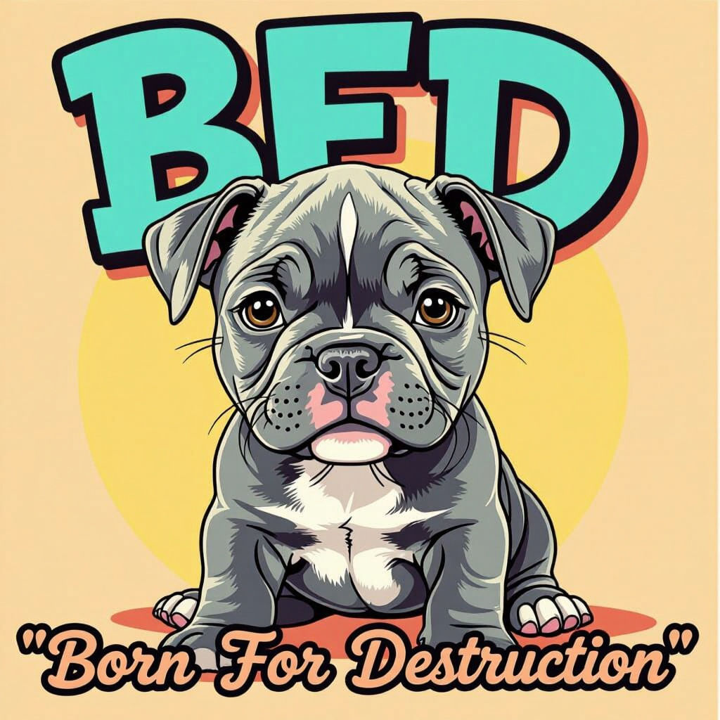 This image shows a charming grey Staffordshire Bull Terrier puppy. Above the puppy are the letters BFD, and below it is the phrase "Born for Destruction".