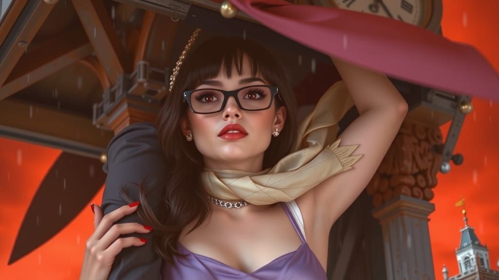 A black and white portrait of a pale woman with red eyes in 1920s attire, embracing a man on a clock tower in the rain. The image is a photorealistic close-up, reminiscent of vintage photography.