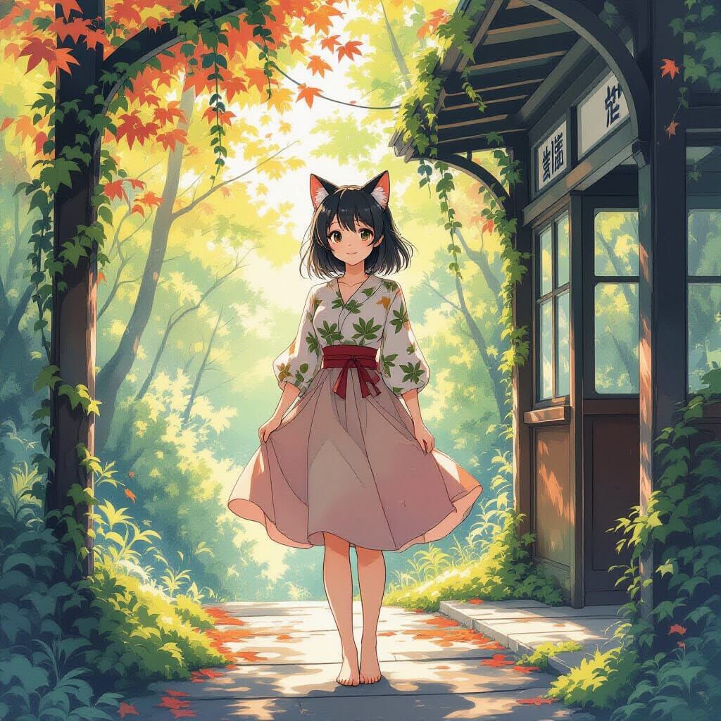 A whimsical scene of an anime catgirl at a vine-covered train station in a magical forest. Features soft autumn light and vibrant watercolor textures.
