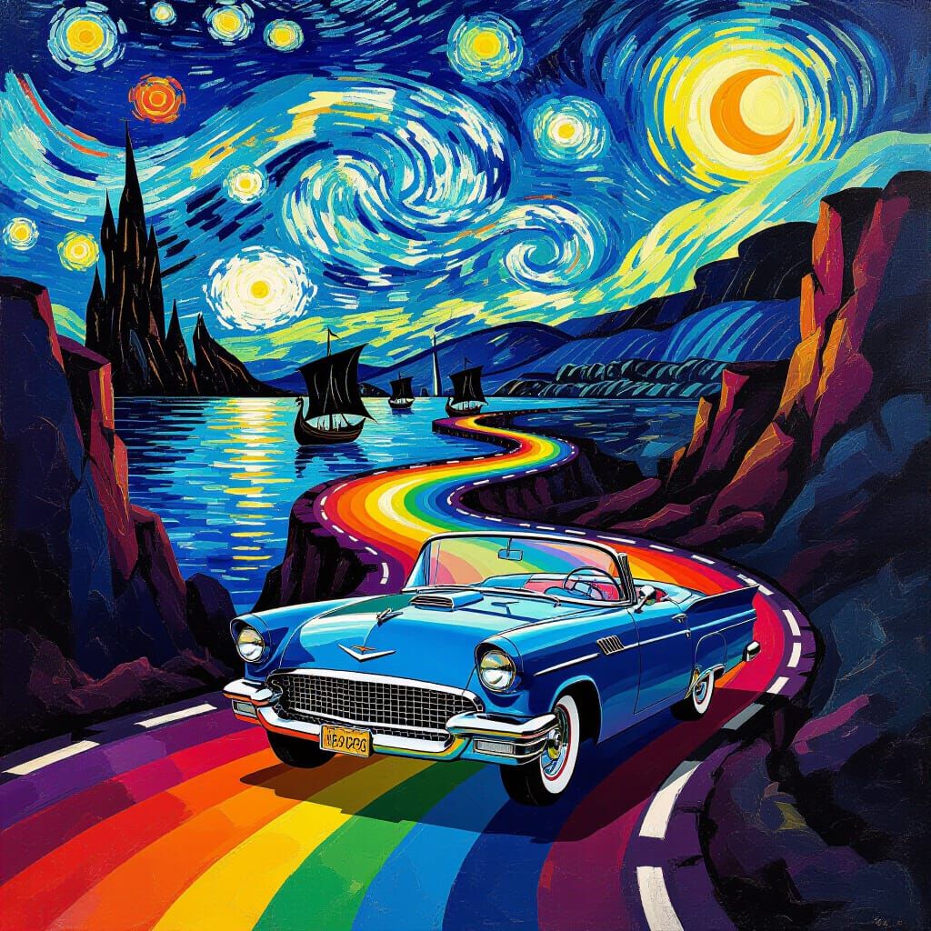 A 1950s convertible travels a vibrant rainbow road through a surreal landscape. This dreamlike scene blends post-impressionist art with Norse mythology and dark fantasy elements.