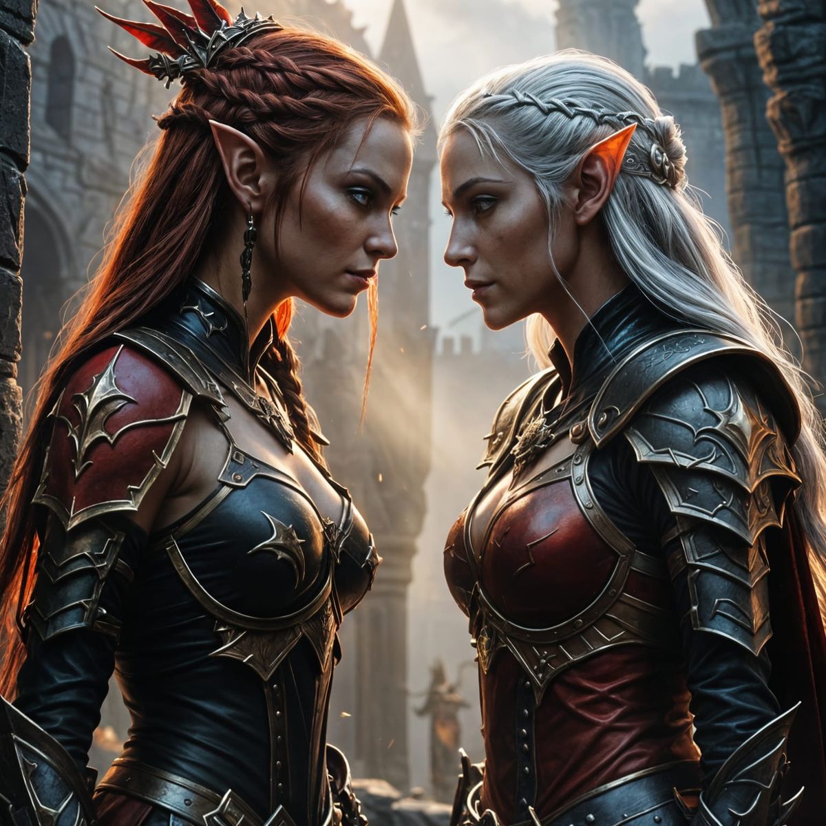 This stunning image depicts two female elf paladins, one with white hair and red armor, the other with long red hair and black armor, engaging in a dramatic showdown. The artwork boasts intricate details, deep colors, and cinematic lighting, evoking a sense of epic fantasy and adventure.