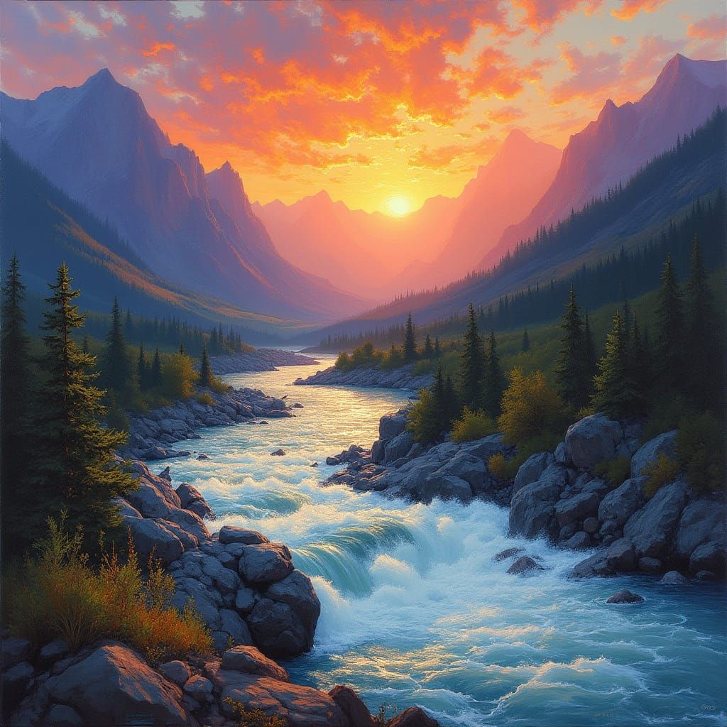 Easily create your own stunning mountain river sunset images with our free AI generator.