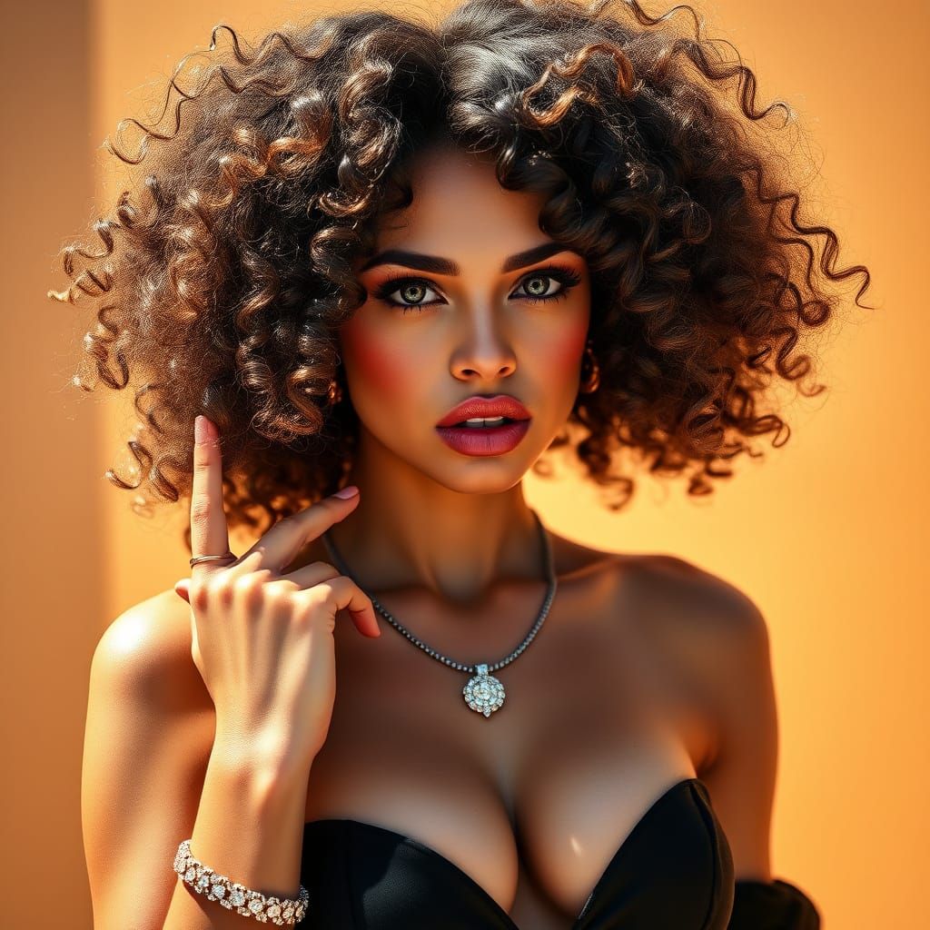 A photorealistic portrait of a curvy woman with curly hair expressing irritation in bright sunlight. The image features long shadows and a vibrant abstract gradient background, as fine art portrait photography.
