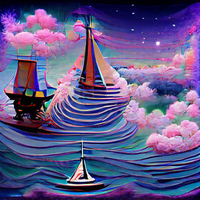 A surreal and peaceful image of a sailboat gliding through a fantastical dreamscape. The dreamy atmosphere is enhanced by soft lighting and ethereal elements.