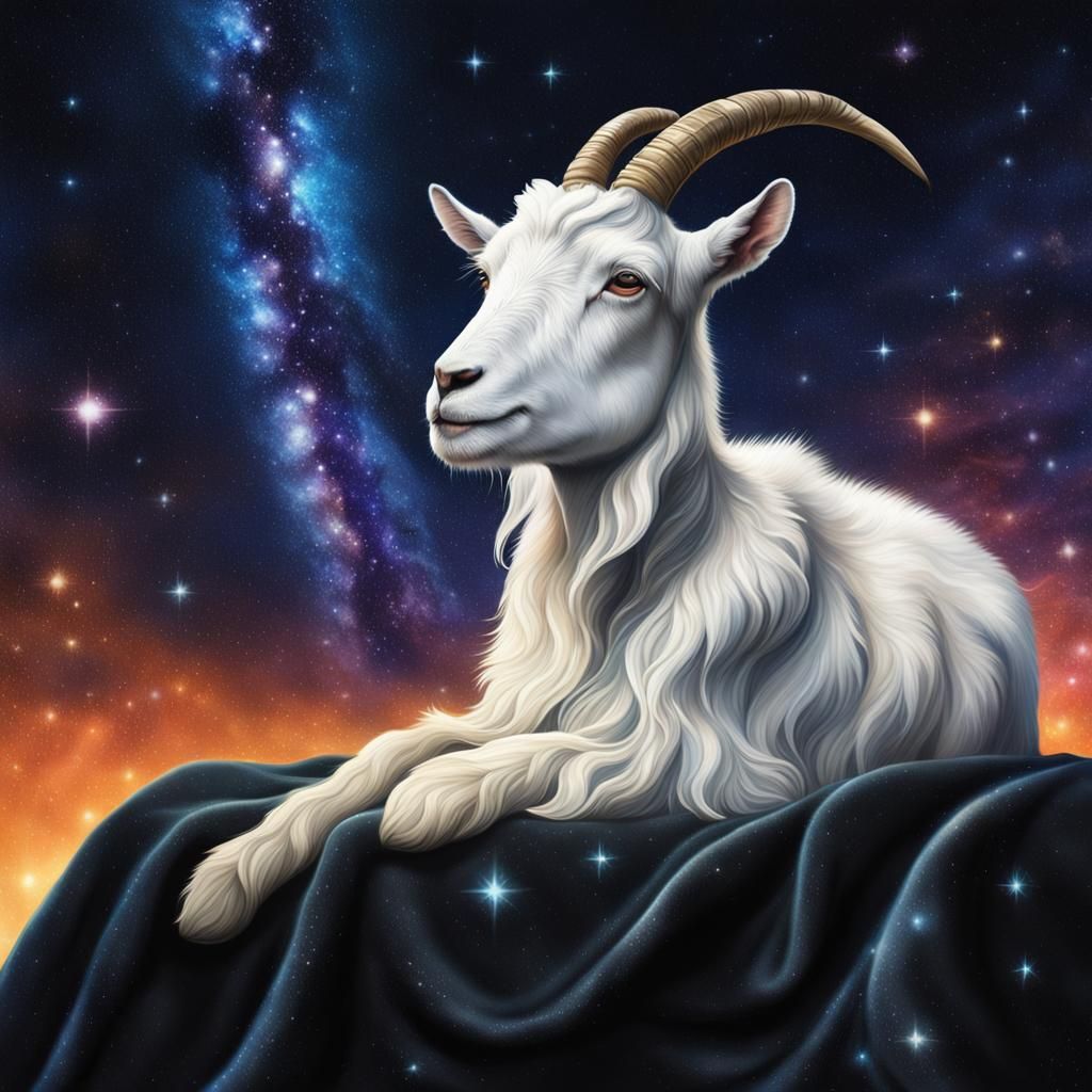 This hyperrealistic image features a soft white goat on a black blanket with the vibrant Milky Way galaxy in the background. Detailed splash art with dramatic lighting and color depth.