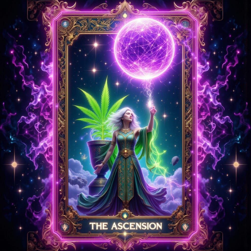 A striking picture of a cannabis fortuneteller summoning a swirling amethyst balloon that tears through a radiant tarot card. The image blends surreal tarot aesthetics with a neon pink and violet ambiance.
