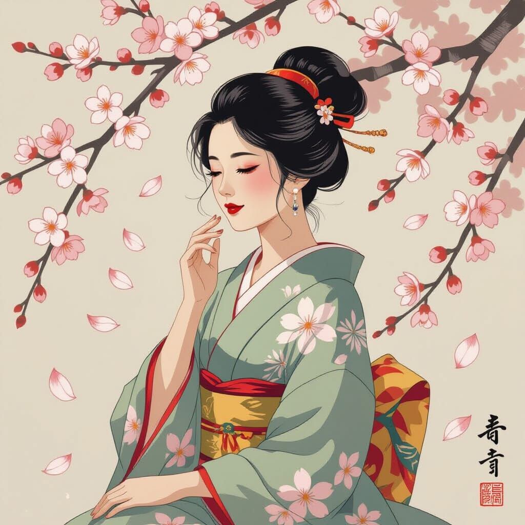 This image shows a serene woman in traditional Japanese clothing. Cherry blossoms surround her as she listens to the wind, rendered in a minimalist Ukiyo-e style.