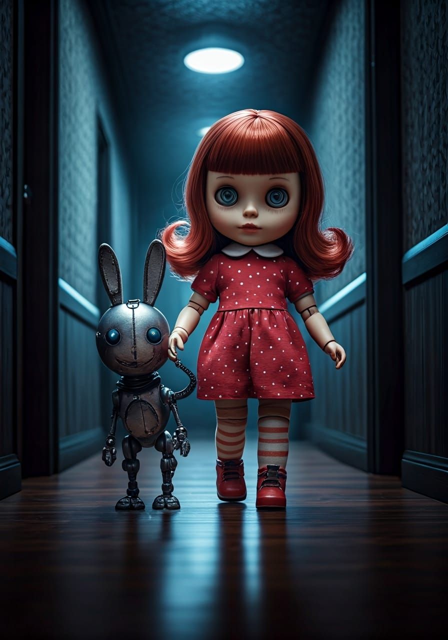 This image shows a doll walking a robot rabbit through a spooky corridor. The scene evokes a sense of unease and mystery.