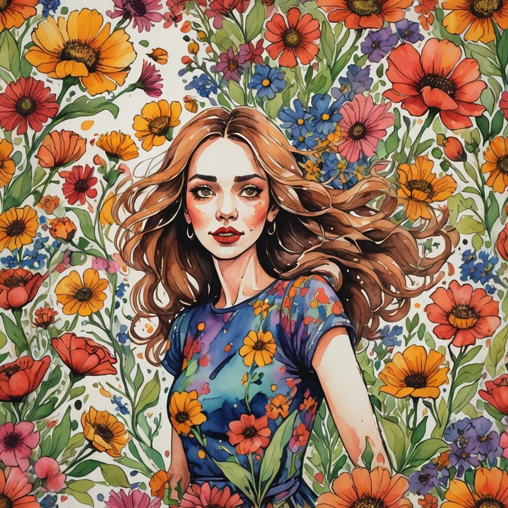 A vibrant watercolor sketch of a woman playfully tossing flowers. The artwork features bold, warm colors and captures a sense of whimsical mischief in its loose, inky style.